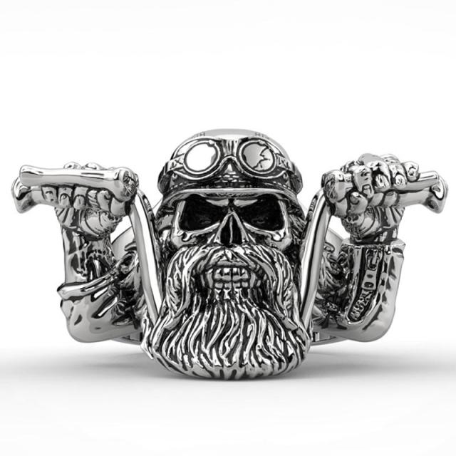 チョッパーのハンドルを握るロングヘア—と髭がトレードマークの面白いステンレスリング。バイク好きの彼氏や父の日のプレゼントにも最適のステンレスリング。