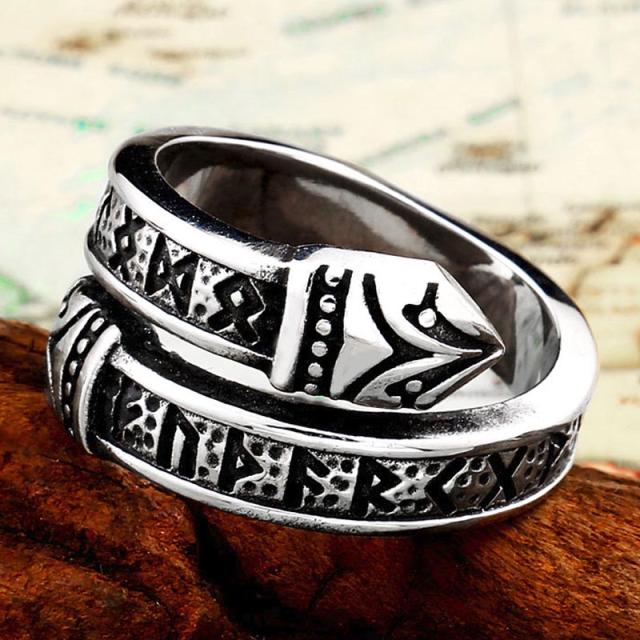 海賊の武器をモチーフにしたおしゃれなフリーサイズのステンレスリング。アーム部分に壁画のようなも文字をデザインしたバイキングリング。