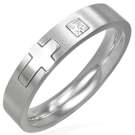 細身ながら肉厚なステンレスリングにクロスとジュエルをデザインしたユニセックスなサージカルリング。