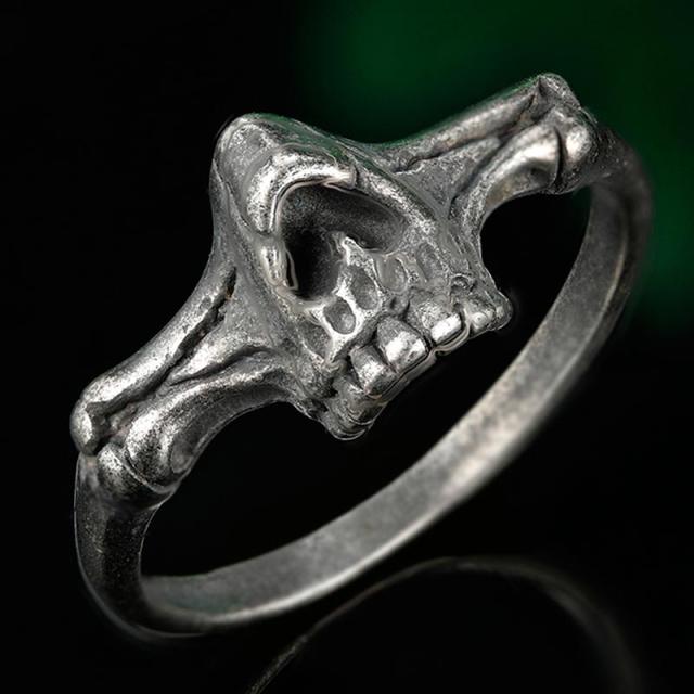 艶消しのマットなアンテークシルバー調に仕上げたサージカルステンレス316L製のドクロの下あごをデザインした不気味なステンレスリング。