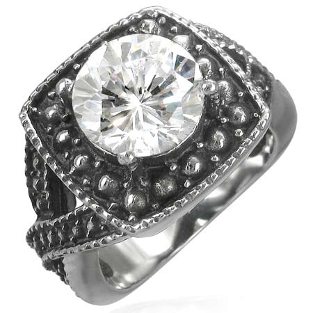 打ち出し細工のクラッシクなデザインの台座に大きなキュービックジルコニアが存在感を発揮する宝石のようなステンレスリング。