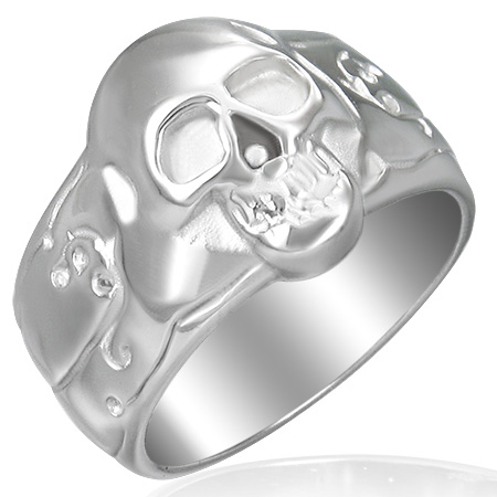 ゴツ系のステンレスリングに浮き上がるようなスカルが不気味さを醸し出す指輪。