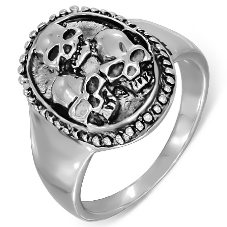 オーバル型の台座に立体的にスカルを3対デザインしたステンレスリング。