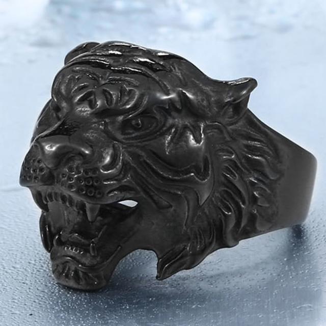黒色ブラックにメッキした立体感のあるリアルな表情が印象的な虎をモチーフにしたステンレスリング。まるで虎のマスクのようなリアルなデザインが存在感を発揮してくれるステンリング。遊び心のある面白いステンレスリングは男子でも女子でも使える。立体感のある虎の指輪は高級感もありプレゼントにも最適。安心で丈夫なサージカルステンレス316L製の指輪は普段づかいにもでき、つけっぱなしでも劣化しにくい。
