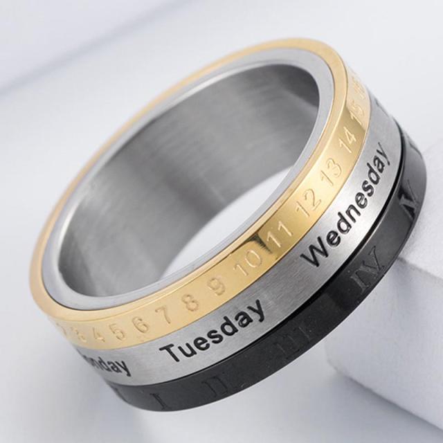 金色にメッキされた部分には1から30までの数字、銀色のステンレスカラーの場所には、英語で1週間の月曜日、火曜日、水曜日、木曜日、金曜日、土曜日、黒色の部分にはローマ数字で1から12をデザインしたカレンダーをモチーフにしたクルクル回る面白いステンレスリング。