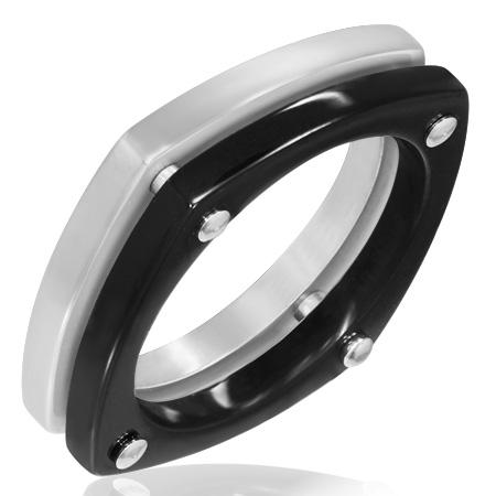緩やかなアールを帯びた四角いブラックとステンカラーのリングをつなげたスタイリッシュな指輪。