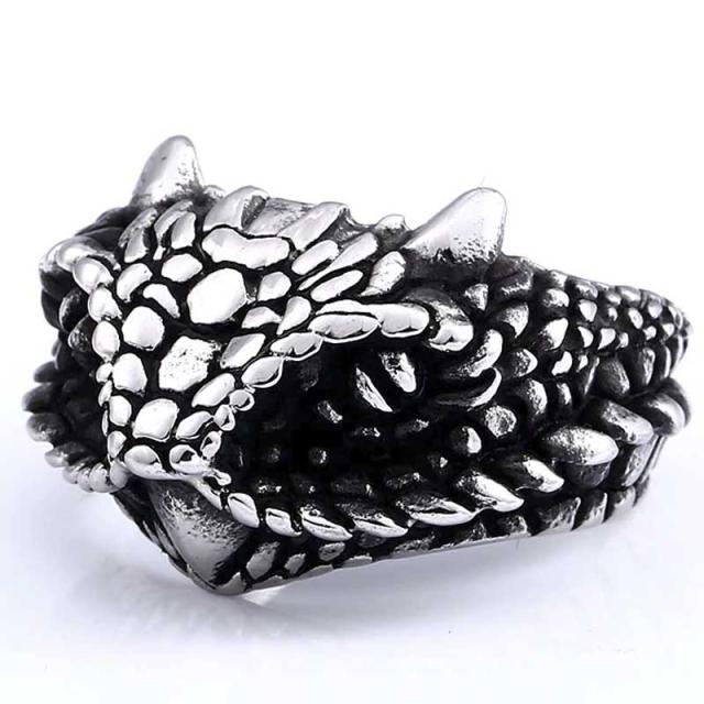 角の生えた不気味な鱗を持つ竜をデザインした個性的なステンレスリング。龍の持つ不気味さと力強さが伝わるステンリング。