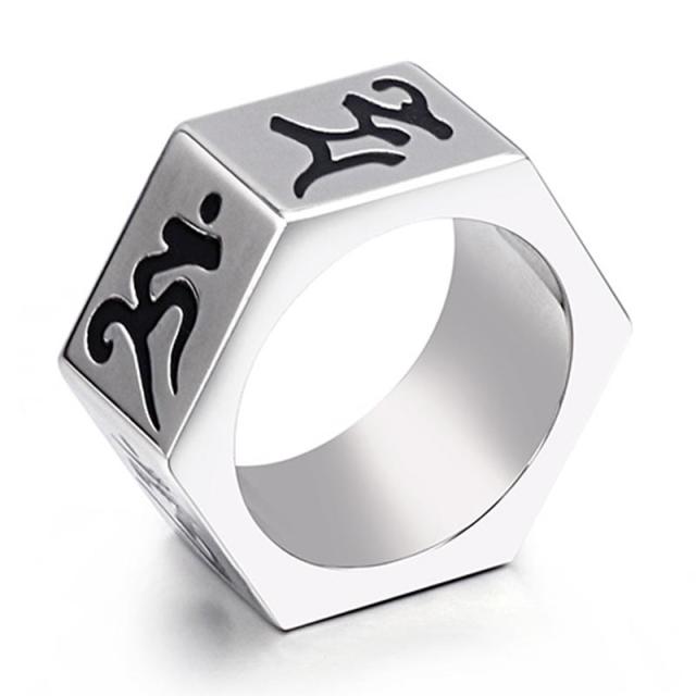 六角形のシンプルで重厚感のある6角形の指輪にいろいろな梵字をデザインしたサージカルステンレス316L製の指輪。