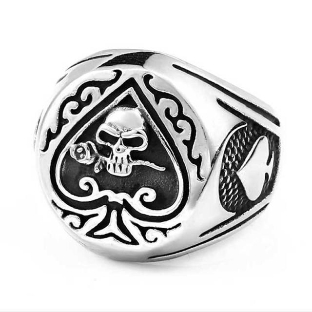 スペードのエースにバラの花を咥えたスカルをデザインしたパンクロックなステンレスリング。