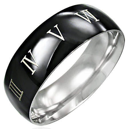 ブラックコーティングしたクールな甲丸リングにローマ数字をデザインした高級感のあるステンレスリング。