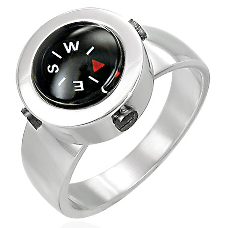 方位磁石をそのままステンレスリングにセットした個性的な指輪。冒険家のカレにお奨めです。(方位磁石としてはご利用いただけません。)