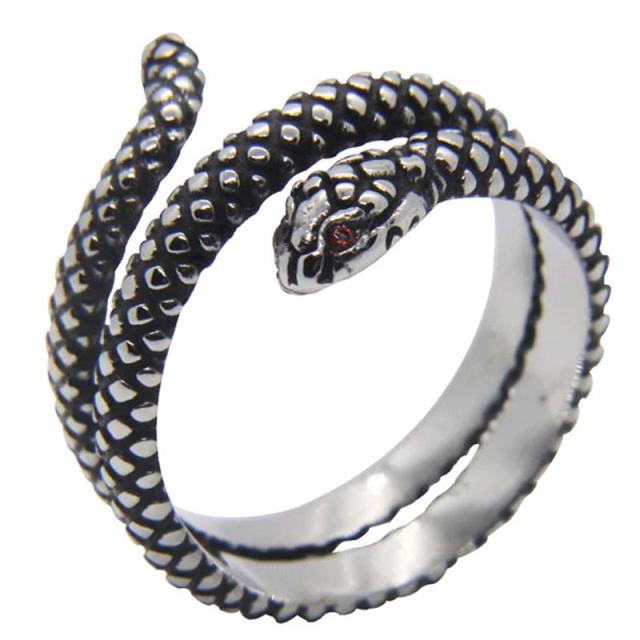 目にガーネットやルビーのような赤色のキュービックジルコニアセットした銀色の蛇が絡みつくサージカルステンレス316L製の指輪。