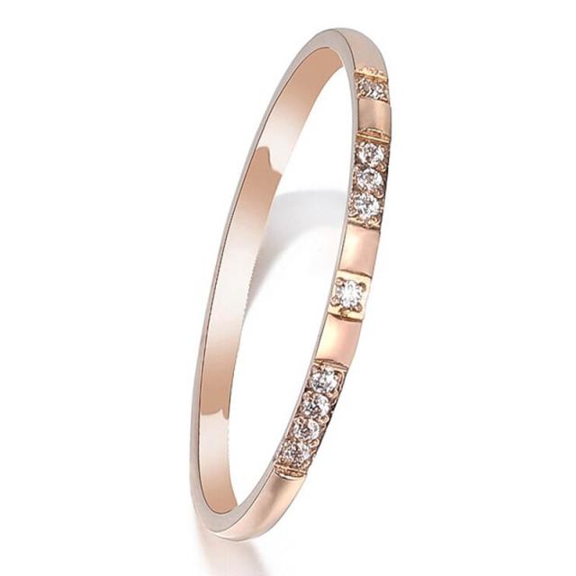 ピンクゴールド色にメッキした細い指輪にクリスタルのキュービックジルコニアをセットセレブリティーな高級のあるサージカルステンレス316L製の指輪。
