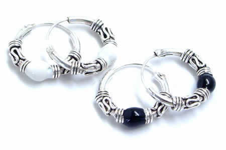 センター部分に色のついたボールをセットし、両サイドをエスニックなデザインで挟み込んだクールなスタイルのフープピアスです。ほどよい大きさが存在感を発揮してくれるユニセックスなアクセサリー!!