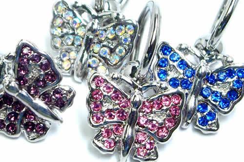 ヘソピアスなどでも人気のジュエルを散りばめたゴージャスな蝶々が、高級感と大人の雰囲気を出すボディジュエリー。大きなチョウのモチーフが女性に人気の秘訣!キャプティブビーズリングのボール部分にモチーフを固定することで、揺れすぎず可愛さよりもかっこよさを追求したチャームピアスピアス。ジュエルカラーはもちろん、内径サイズも選べるので自分に合ったピアスが選べる。固定式のチャームピアス耳たぶだけでなく、軟骨ピアス(ヘリックス)はもちろん、へそピアスにも使えるボディピアスです。モチーフとビーズリングが垂直につながっているので、耳やヘソピアスにしても、ちゃんとデザインが正面を向くのがうれしい。プレゼントにも最適のボディピアスです。