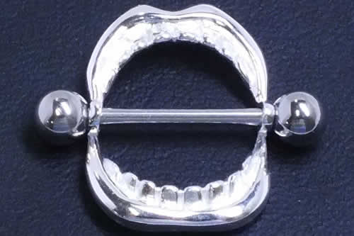 大きく口を開けたシールドをセットしたユニークな乳首用ボディピアス。今にも乳首に噛み付きそうなリアルな歯とセクシーな唇が大人のあなたを満足させてくれるニップルジュエリー。遊び心のあるニップルは、プレゼントにしてもきっと喜んでもらえる。お手ごろ価格なので下着感覚で色々なニップルを楽しんで欲しい。