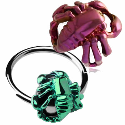 ステンレス製のサソリを発色させたカラフルなデコレーションパーツ。蠍のパーツを8mmサイズのボールに押し込むようにはめるだけで簡単にデコレーションできるパーツ。ビーズリングでもバーベルでもラブレットでも8mmサイズのボールならどれでも簡単にデコレーションできる。素材も安心のステンレスで、発色させているので、色も落ちにくい。いつものボディピアスを簡単に飾れるアイテムです。