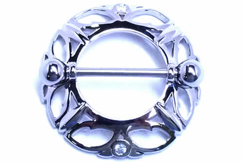 透かしが綺麗なニップルシールドにクリスタルのジルコニアをプラスした大人ビューティなボディピアス。あなたを綺麗に魅せる最愛のジュエリー。マニアじゃなくてもこの美しさに魅了されること間違いなしの乳首ピアス。おっぱいのピアスだからって女性だけのものではありませんよ!もちろん男性にもお奨め!程よい厚みもあって素材も医療用サージカルステンレスなので安心で高級感にも満足。プレゼントにも最適です。下着感覚で楽しめるボディピアス。