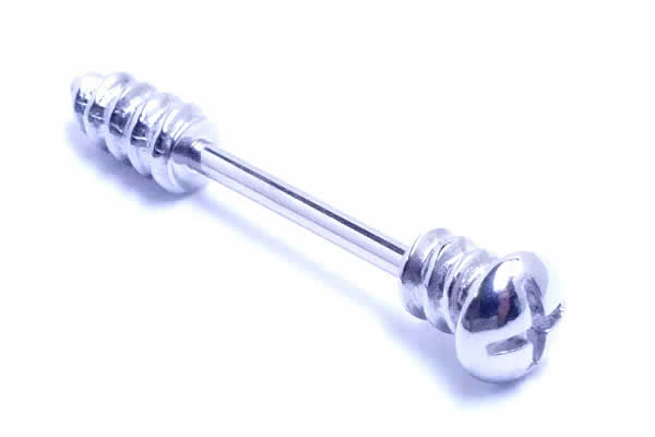 リアルにネジをデザインしたニップルバーベル。装着するとまるでネジが刺さっているように見えるハードテイストのボディピアス。シャフトはもちろんデザイン部分もサージカルステンレスなので安心。両側のパーツが外せるので、自分だけのカスタムもできる。ニップルピアスとしてだけでなく、耳たぶやヘリックスなどの軟骨ピアスなどいろいろな場所にも使えます。内径サイズが選べるのもうれしい。
