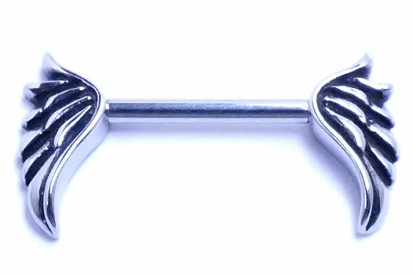 天使の羽ををモチーフにしたニップルバーベル。シャフトはもちろんデザイン部分もサージカルステンレスなので安心。両側のパーツが外せるので、自分だけのカスタムもできる。ニップルピアスとしてだけでなく、耳たぶやヘリックスなどの軟骨ピアスなどいろいろな場所にも使えます。内径サイズが選べるのもうれしい。