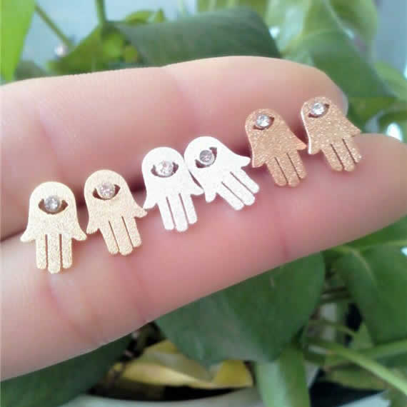 ハムサをデザインしたオリエンタルなステンレスピアス。ステンレスの地金に高級感のある輝きを出すためにシルバーとゴールドとピンクゴールドのメッキをしたこだわりのステンレスピアスです。プレゼントにもおすすめ!メンズでもレディースでも使えるおしゃれなステンピアスです。
