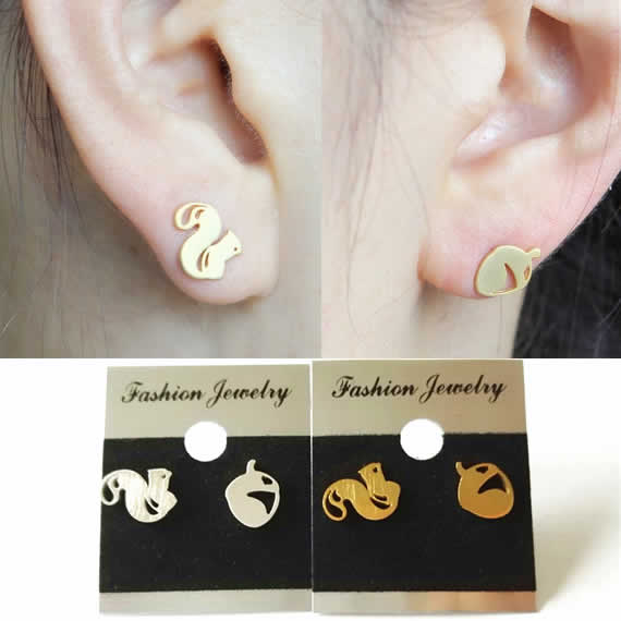 リスとドングリをデザインしたポップでかわいいステンレスピアス。ステンレスの地金に高級感のある輝きを出すためにシルバーとゴールドとピンクゴールドのメッキをしたこだわりのステンレスピアスです。プレゼントにもおすすめ!メンズでもレディースでも使えるおしゃれなステンピアスです。