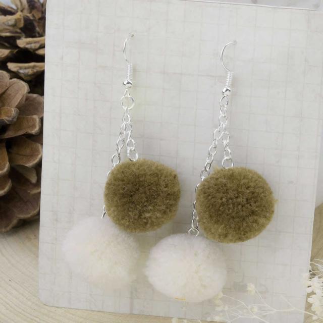 可愛いグリーンとホワイトベージュのボンボンチャームが揺れるモコモコのステンレスピアスです。冬や秋には欠かせない可愛いモコモコピアス。フック部分の素材も安心のステンレス。しかもこの価格はうれしい。プレゼントしてもきっと喜んでもらえるピアスです。ピアスが開いていない人は、別売りのイヤリングパーツに付け替えてイヤリングにしても楽しめる。