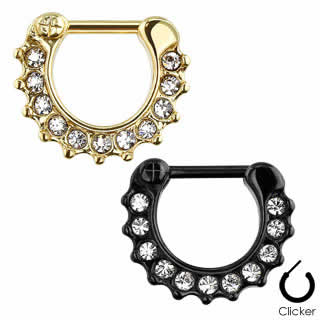 カラージェムセプタムクリッカー 16ゲージ 16G 14G 14ゲージ ブラック 黒色 ゴールド 金色 クリスタル ジルコニア 鼻ピアス サージカルステンレス316L メンズ レディース 軟骨 乳首 リング型 ボディピアス 鼻の真ん中の軟骨にするボディーピアス ヒンジ付き