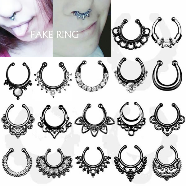 スタイリッシュな黒色のデザインのフェイクリングばかりを集めました。ピアスホールを開けずに装着できるクリップノーズセプタムリング。クリップ型なので、セプタムの位置だけでなくノーズリングとしてもイヤーカフとして耳にも、ニップルクリップなどいろいろなフェイクピアスに使えます。カラーも豊富でスタイルによって装着できる。ピアスを開けていなくても簡単に装着できるので、プレゼントにも!海外セレブの間でも話題のセプタムリングです。
