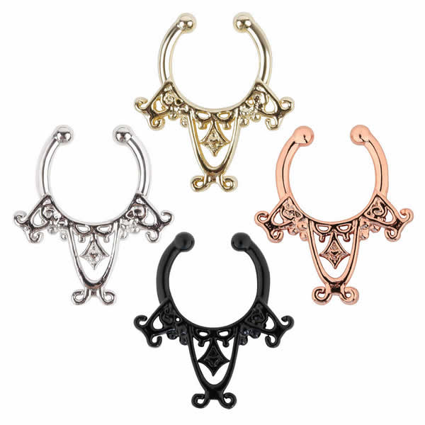 ピアスホールを開けずに装着できるクリップノーズセプタムリング。クリップ型なので、セプタムの位置だけでなくノーズリングとしてもイヤーカフとして耳にも、ニップルクリップなどいろいろなフェイクピアスに使えます。カラーも豊富でスタイルによって装着できる。ピアスを開けていなくても簡単に装着できるので、プレゼントにも!海外セレブの間でも話題のセプタムリングです。