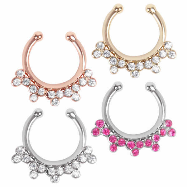 ビジューが綺麗なフェイクリング。ピアスホールを開けずに装着できるクリップノーズセプタムリング。クリップ型なので、セプタムの位置だけでなくノーズリングとしてもイヤーカフとして耳にも、ニップルクリップなどいろいろなフェイクピアスに使えます。カラーも豊富でスタイルによって装着できる。ピアスを開けていなくても簡単に装着できるので、プレゼントにも!海外セレブの間でも話題のセプタムリングです。