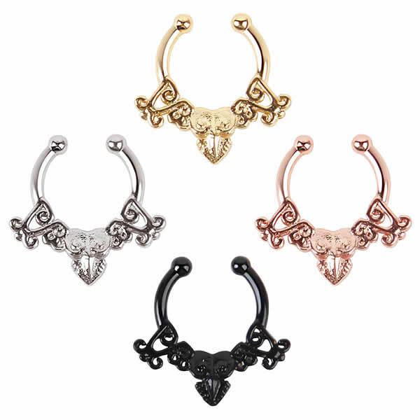 ピアスホールを開けずに装着できるクリップノーズセプタムリング。クリップ型なので、セプタムの位置だけでなくノーズリングとしてもイヤーカフとして耳にも、ニップルクリップなどいろいろなフェイクピアスに使えます。カラーも豊富でスタイルによって装着できる。ピアスを開けていなくても簡単に装着できるので、プレゼントにも!海外セレブの間でも話題のセプタムリングです。
