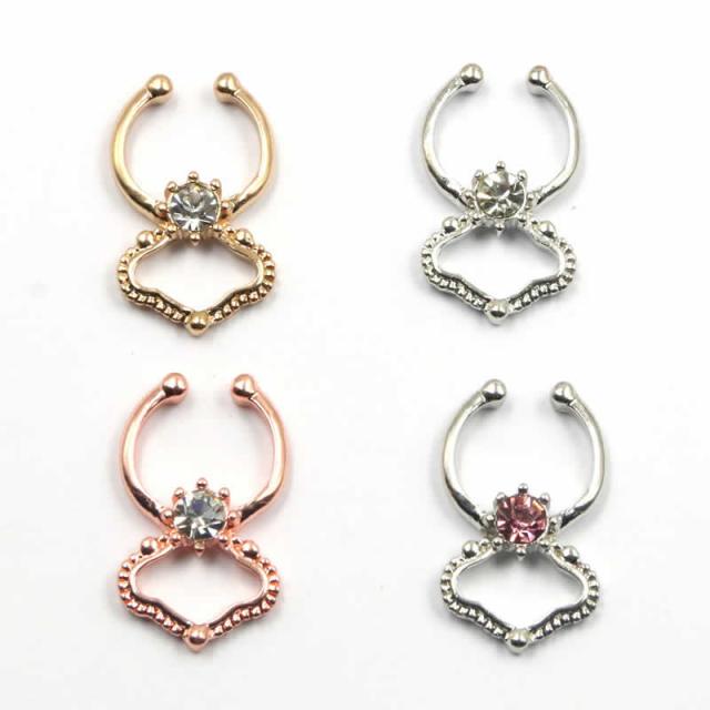 個性的なデザインにビジューをセットしたフェイクリング。ピアスホールを開けずに装着できるクリップノーズセプタムリング。クリップ型なので、セプタムの位置だけでなくノーズリングとしてもイヤーカフとして耳にも、ニップルクリップなどいろいろなフェイクピアスに使えます。カラーも豊富でスタイルによって装着できる。ピアスを開けていなくても簡単に装着できるので、プレゼントにも!海外セレブの間でも話題のセプタムリングです。