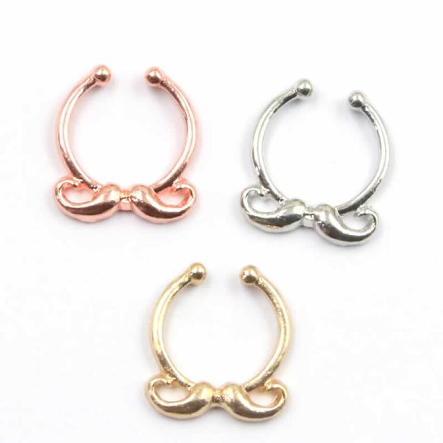 髭をデザインしたフェイクリング。ピアスホールを開けずに装着できるクリップノーズセプタムリング。クリップ型なので、セプタムの位置だけでなくノーズリングとしてもイヤーカフとして耳にも、ニップルクリップなどいろいろなフェイクピアスに使えます。カラーも豊富でスタイルによって装着できる。ピアスを開けていなくても簡単に装着できるので、プレゼントにも!海外セレブの間でも話題のセプタムリングです。