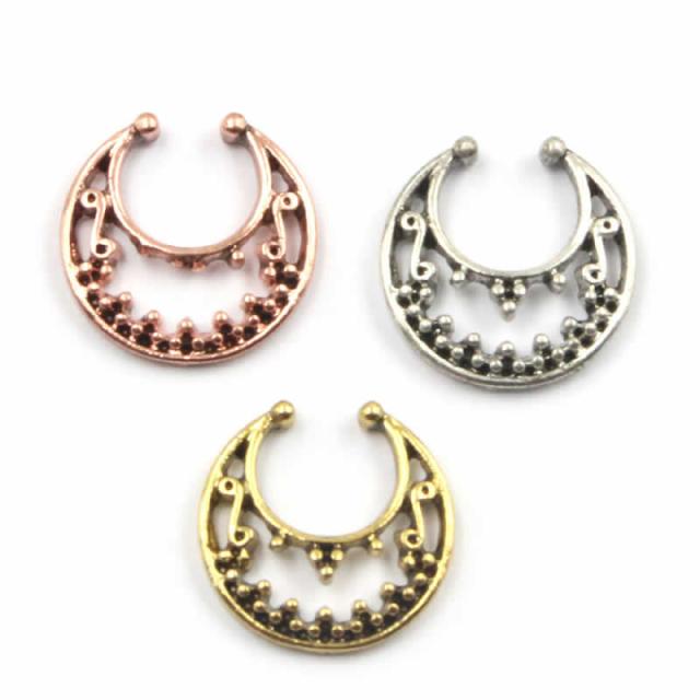 存在感のあるデザインのフェイクリング。ピアスホールを開けずに装着できるクリップノーズセプタムリング。クリップ型なので、セプタムの位置だけでなくノーズリングとしてもイヤーカフとして耳にも、ニップルクリップなどいろいろなフェイクピアスに使えます。カラーも豊富でスタイルによって装着できる。ピアスを開けていなくても簡単に装着できるので、プレゼントにも!海外セレブの間でも話題のセプタムリングです。