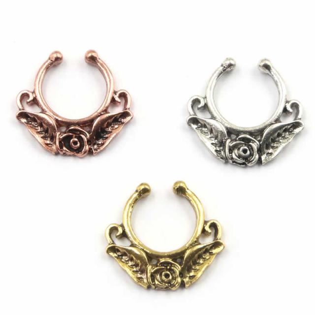 薔薇の花をデザインしたフェイクリング。ピアスホールを開けずに装着できるクリップノーズセプタムリング。クリップ型なので、セプタムの位置だけでなくノーズリングとしてもイヤーカフとして耳にも、ニップルクリップなどいろいろなフェイクピアスに使えます。カラーも豊富でスタイルによって装着できる。ピアスを開けていなくても簡単に装着できるので、プレゼントにも!海外セレブの間でも話題のセプタムリングです。