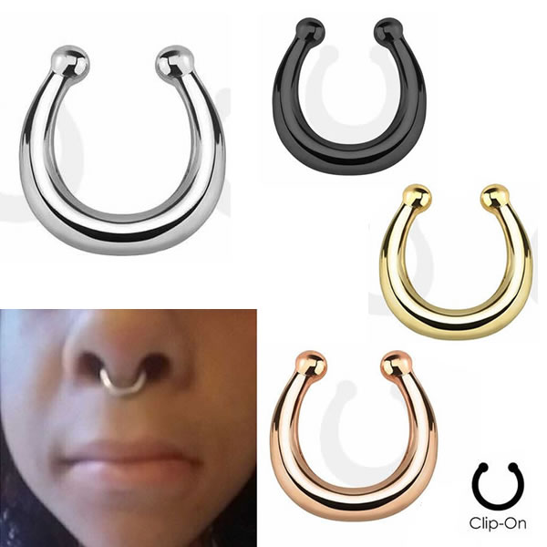 シンプルでプレーンなフェイクリング。ピアスホールを開けずに装着できるクリップノーズセプタムリング。クリップ型なので、セプタムの位置だけでなくノーズリングとしてもイヤーカフとして耳にも、ニップルクリップなどいろいろなフェイクピアスに使えます。カラーも豊富でスタイルによって装着できる。ピアスを開けていなくても簡単に装着できるので、プレゼントにも!海外セレブの間でも話題のセプタムリングです。