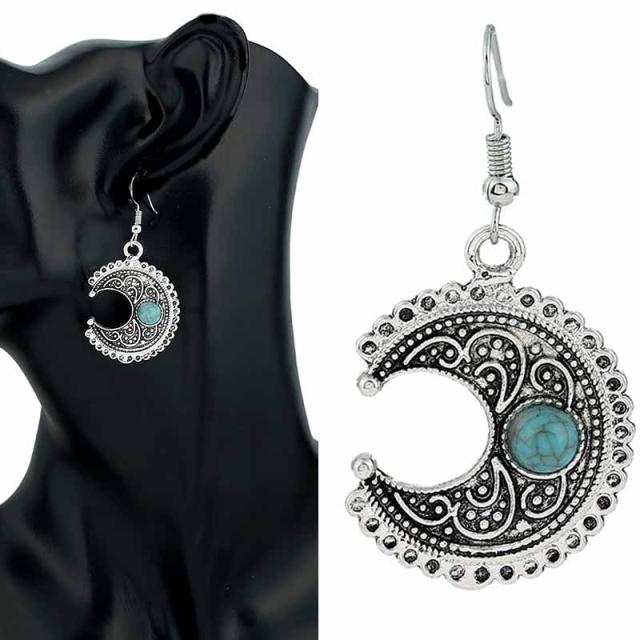 三日月型のアンティークなフレームに丸型のトルコ石をセットしたステンレスピアス。ボヘミアンなスタイルをアシストしてくれるステンレスピアス。存在感のあるトルコ石がおしゃれ心をくすぐる。アンティークシルバーと鮮やかなターコイズがクラシックな雰囲気を醸し出す。プレゼントにもきっと喜んでもらえます。フックパーツを別売りのイヤリングパーツに変更してイヤリングにもできる。ご自分で加工するのが面倒なときはお気軽にお申し付けください。