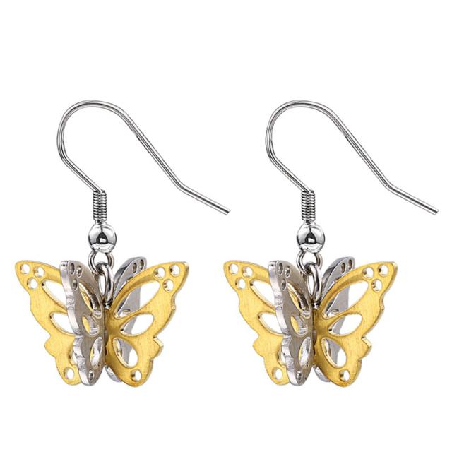金色と銀色の蝶々を模ったプレートを立体的に重ねてステンレスピアス。蝶々の部分もフック部分もステンレスなので安心。