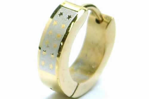 高級感のあるゴールドリングに12個の星をデザインしたパンキッシュなゴールドピアス。男女を問わない人気のモチーフ星とゴージャスな金のフープピアスのコンビネーションがスパンコールのようなキラキラ感で、幅広いそうに愛されるピアスです。素材がボディピアスと同じ医療用(サージカル)ステンレス316なので、アレルギーを起こしにくく、サイズも普通のピアスと同じなので、誰でもが装着できる人気のステンレスリングです。ファーストピアスとしても使いたい。装着の仕方も、フープピアスの真ん中部分が折れるセンター着けのタイプなので簡単に装着でき、フープピアス初めての人でも安心。鹿も片耳用(1個)販売なので、必要な数だけ買えて無駄がなく価格も安いのがうれしい。プレゼントにも最適な医療用素材のピアス。通常サイズのピアスなので、ヘリックスやトラガスにも簡単に使える。