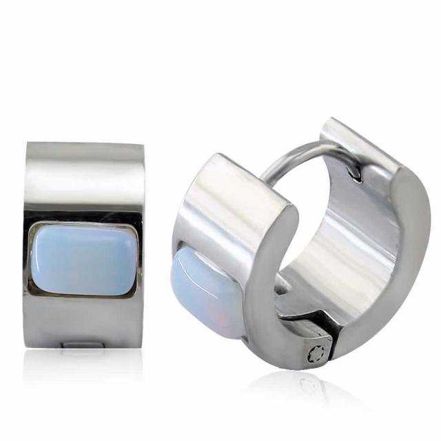 ステンレスのフープピアスのトップにオパール色に輝くストーンをセットした高級感のあるステンレスピアス。シンプルだけど存在感のあるステンレスピアス。リングピアス全体が広がるワンタッチタイプなので、装着も簡単。素材も安心のサージカルステンレスなので、ファーストピアスやセカンドピアスにも使いたい。