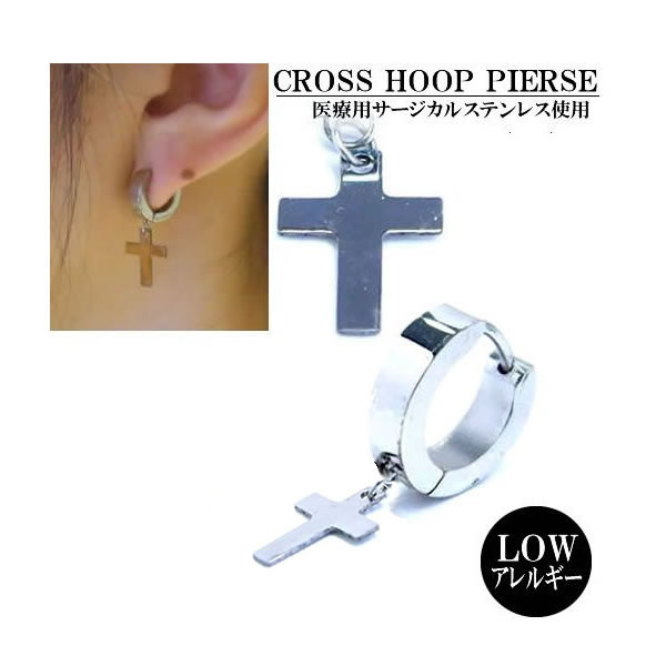 プレーンなリングピアスにクロスのチャームが揺れるステンレスピアス。人気の十字架モチーフをフープピアスのチャームにすることでシンプルでクールに存在感をアピールするサージカルピアスです。メンズもレディースも使えるピアスです。フープピアスのセンター部分から中折れするワンタッチタイプのリングピアスなので、ピアス初心者でも簡単に着脱出 来るピアスです。素材も安心の医療用サージカルステンレスなので、ファーストピアスとしても使えるオススメのステンレスアクセサリーです。肉厚でしっかり とした作りと、ボディピアス好きならご存知のサージカルステンレスの輝きが、高級感を発揮してくれるサージカルアクセサリー。単品販売(片耳販売)なので、必要な数量だけ買えて、お値段もリーズナブルなので、いくつも揃えたくなるステンピアスです。