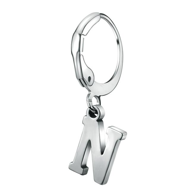 細身のレバーバックタイプのリングピアスに英語のアルファベットのN(エヌ)のチャームが揺れるステンレスピアス。