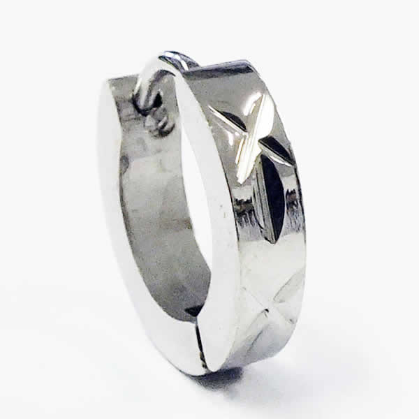 リングピアスに綺麗なカットをデザインしたステンレスピアス。低アレルギーのステンレスは安心で丈夫。ポスト部分だけではなく、全身ステンレスなのもうれしい。プレゼントにもおすすめのステンレスピアス。メンズでもレディースでも使えるフープピアスです。