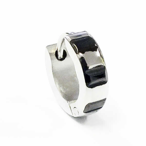 黒とシルバーのシマ縞模様をデザインした小さなリングピアス。低アレルギーのステンレスは安心で丈夫。ポスト部分だけではなく、全身ステンレスなのもうれしい。プレゼントにもおすすめのステンレスピアス。メンズでもレディースでも使えるフープピアスです。