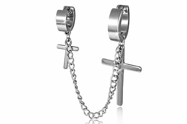 大きさの異なるフープピアスをチェーンでつなげ、十字架のチャームをセットしたステンレスピアス。耳たぶと軟骨をつなげれば存在感もばっちり!パンクロックなコーディネートをアシストしてくれる。素材も安心のサージカルステンレス。プレゼントしてもきっと喜んでもらえる。