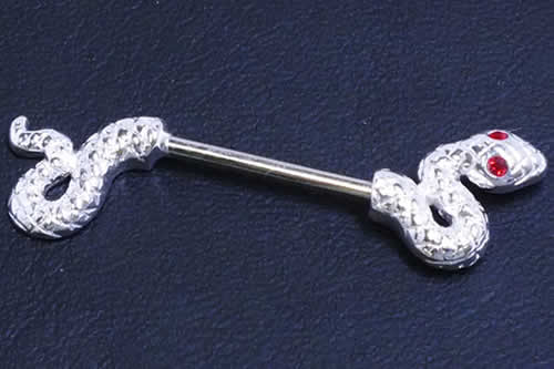 ヘビをモチーフにしたクールなバーベルです。へびの目にジュエルをセットする事で、注目度もアップ。ヘビをモチーフにしたジュエリーは男女を問わず人気が高い。耳以外にニップルやネイプにも使えるオシャレなボディーピアス。遊び心のあるボディピアスは、プレゼントにもお奨め!お手ごろ価格なのも嬉しいアクセサリーです。