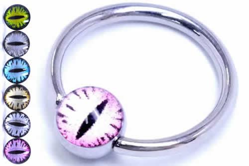 蛇の目をモチーフにした不気味なボールをセットしたキャプティブビーズ型のボディピアス。ヘビの目の色や大きさも選べて、プラグタイプやステンレスピアスも揃う人気のデザイン。ヘビの持つ目力に威圧されそう。キャプティブビーズリングタイプなので、耳やニップル、軟骨など、オールラウンド使えるボディピアスです。ペアで愛用したりプレゼントにもお奨めです。