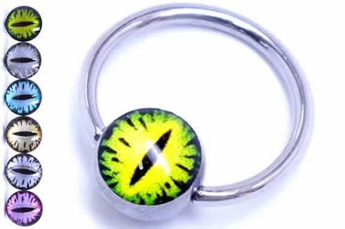 蛇の目をモチーフにした不気味なボールをセットしたキャプティブビーズ型のボディピアス。ヘビの目の色や大きさも選べて、プラグタイプやステンレスピアスも揃う人気のデザイン。ヘビの持つ目力に威圧されそう。キャプティブビーズリングタイプなので、耳やニップル、軟骨など、オールラウンド使えるボディピアスです。ペアで愛用したりプレゼントにもお奨めです。
