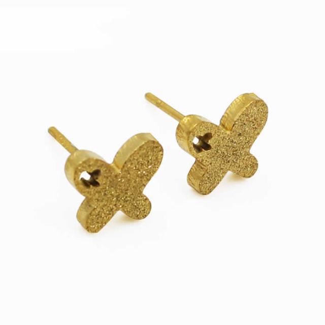 ゴールドの喋々にブラスト加工することでまるでラメのようなきれいな輝きを放つステンレスピアス。チョウの羽の部分を透かしことでオシャレ度アップ。プレゼントにも人気のステンレスピアスです。高級感のあるピアスはプレゼントにも!